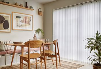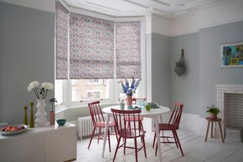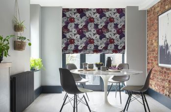 • grey pleated blinds fitted to a window in a white decorated dining room