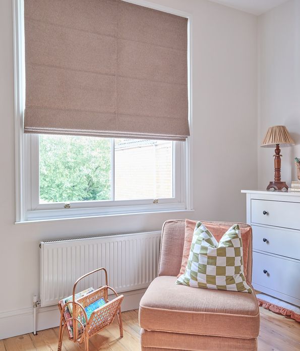 • Rose coloured folded Roman Blind and curtain fabric of Darcia Rose