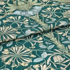 • A folded piece of fabric with Flourish Sage Light Green printed on it