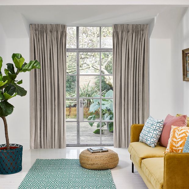 How curtains hang is defined by the way it joins the pole or track; this is the heading, and there are six to choose from: Pencil Pleat, Deep Pencil Pleat, Eyelet, Wave, Double Pinch Pleat, and Triple Pinch Pleat. Eyelet curtains thread onto a curtain pole through metal rings, and hang in deep uniform folds, creating a contemporary feel. A pencil pleat heading gathers the fabric across the top of the curtain in a very traditional way and can be used with a pole or a track. A pinch pleat heading creates a much more tailored appearance, gathering fabric in neat folds that are spaced across the top of the curtain. This heading also works with either a pole or a track. Wave headings create a relaxed and informal feel, with soft uniform folds. They must be fitted to a Wave track specifically designed for this type of header.