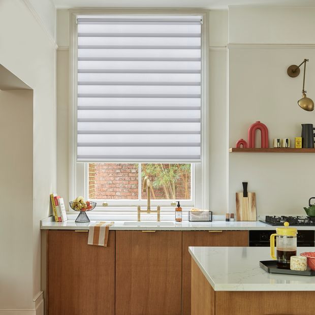 This is a fabric blind that is made up of two layers – one opaque and one sheer. The blinds work in a similar way to louvred blinds. The two fabric layers give the blind a striped appearance and provide flexible options for light control. In the opaque-sheer position the blinds gently filter light and provide daytime privacy, and in the opaque-opaque position, they block out the light to provide complete privacy. The blind can also be opened up fully away from the window.