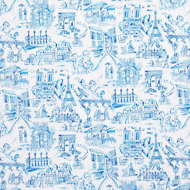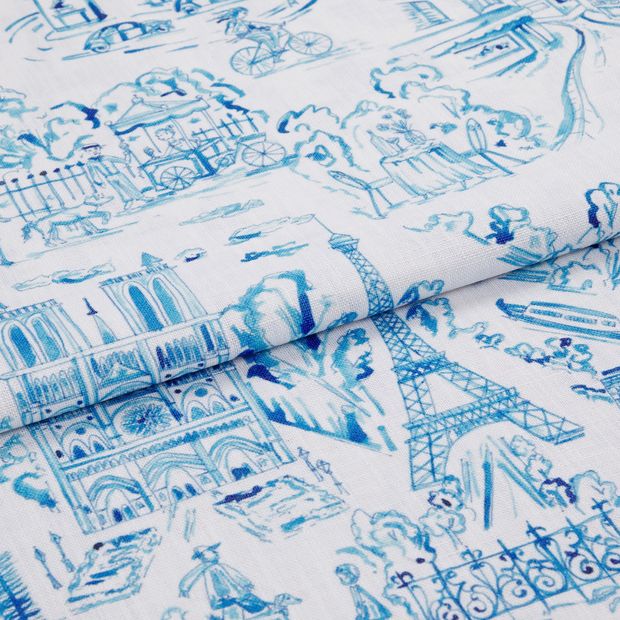 Our new Parisian Edit collection is all about the joie de vivre the city is famed for, and nothing captures that ethos better than this Roman blind in Toile de Paris Bleu. Like a fabric sketchbook, the sights of the city appear before your eyes in a blue pen and ink style, from the elegant Notre Dame cathedral to the iconic Art Nouveaux lamp posts on the bridge over the Seine. There’s a light-heartedness to the subject, as an excited dog strains at the leash to get to an ice cream stall and a man rides by on a bike with baguettes on the back and we think you’ll smile every time you lower the blind and watch the city work its charms on your room.
